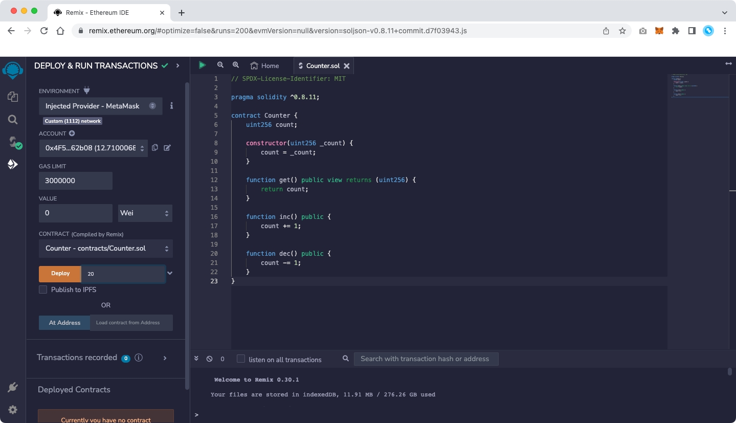 From the Deploy & Run Transactions screen, you can select the environment you want to deploy and deploy Smart Contract to test it. The figure below is an example of a deployment to the WEMIX3.0 testnet using the "Injected Provider-Metamask" provided by Remix.
