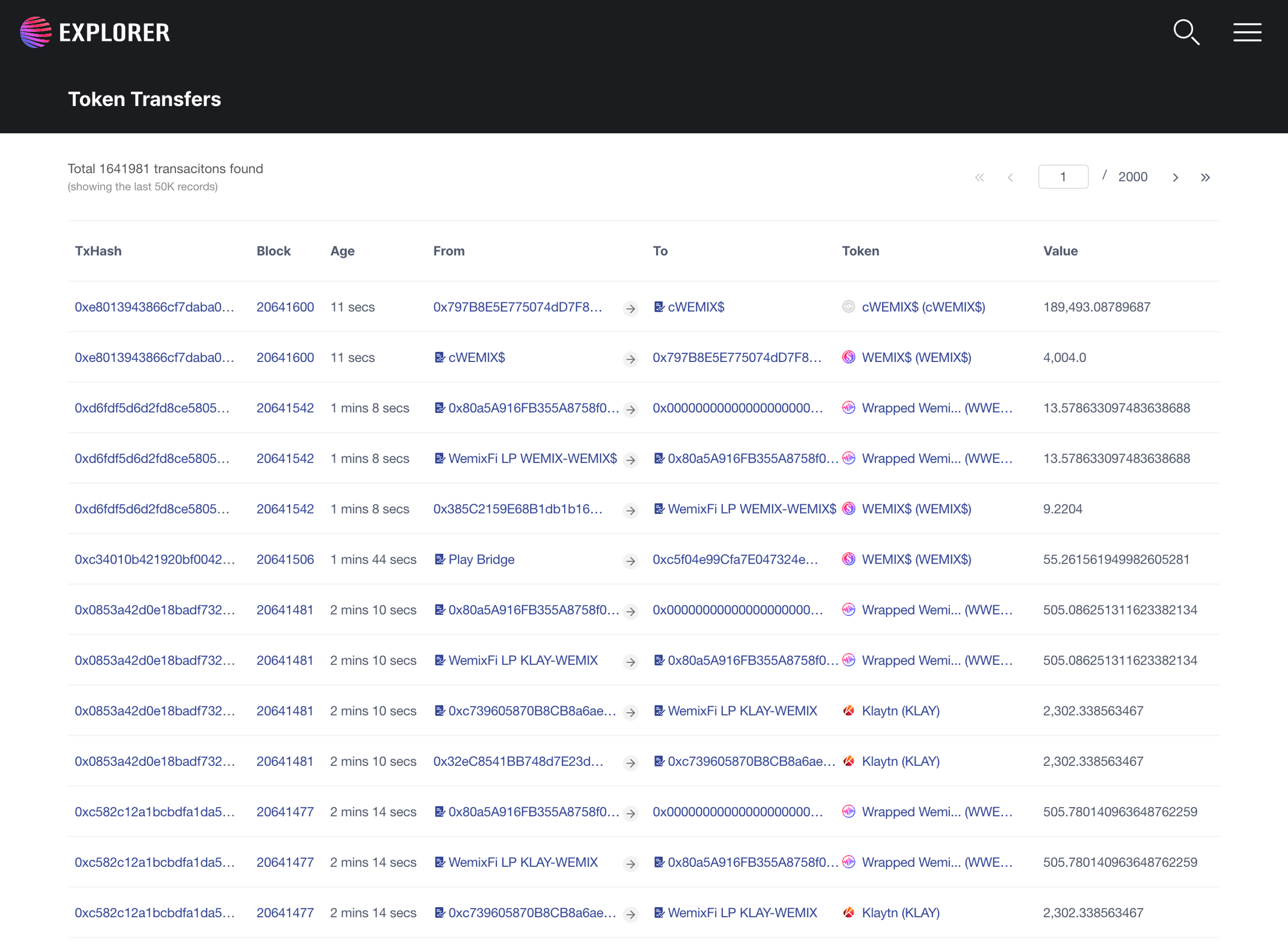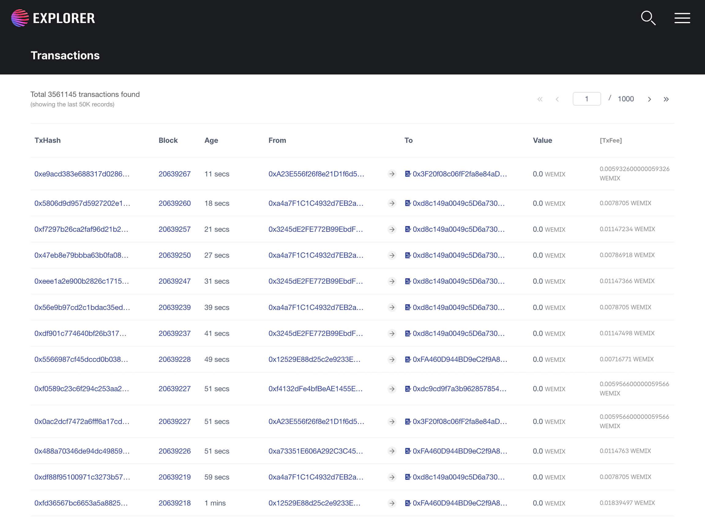 This Web UI shows a table of transactions on WEMIX transactions sorted by time. At the top of the table, a title shows the total transactions matching the URL filter. The table shows 50 records by default. Each record is a WEMIX transaction. This table has seven columns: