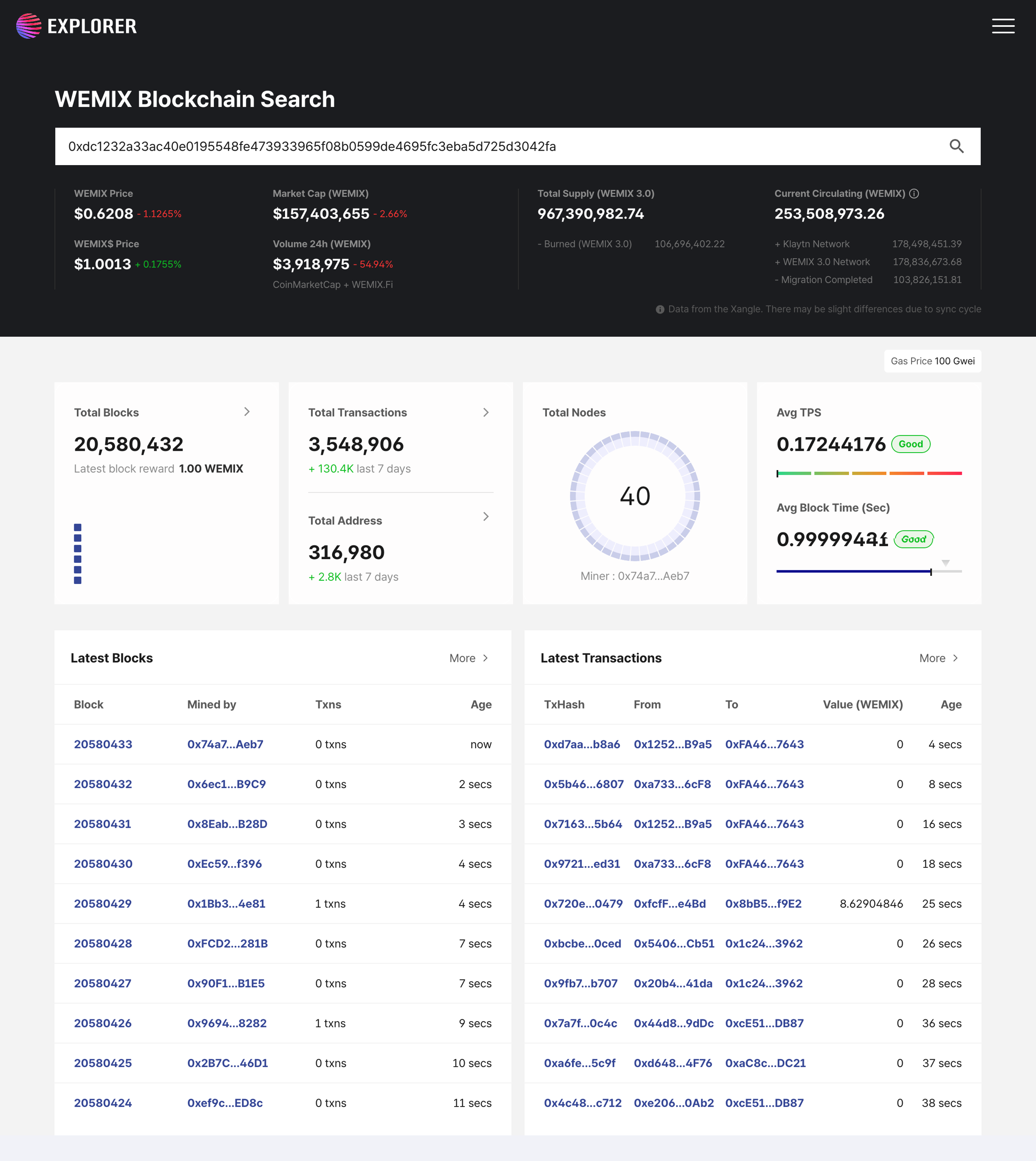 This is the main screen of WEMIX Explorer. You can check block, transaction, node operation, WEMIX price information, etc.