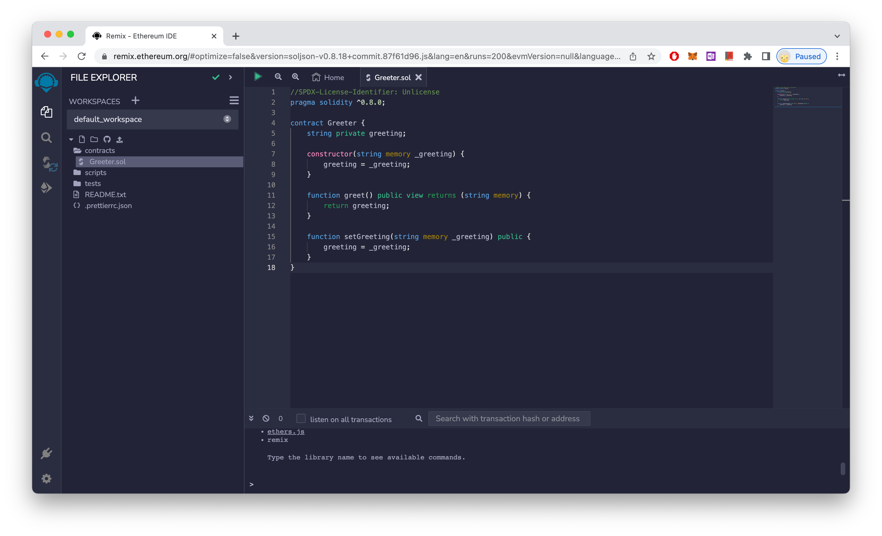When you access the Remix IDE, there are pre-generated contracts. Select and clear these contracts, create a new Greeter.sol, and enter the code above.