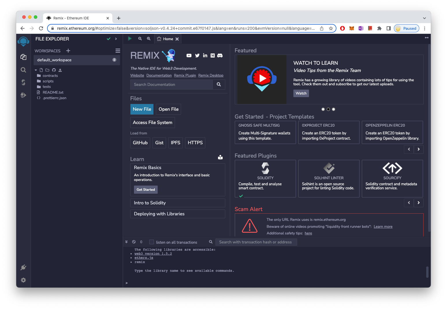 <figure><img src="https://content.gitbook.com/content/Hf9f4FuSvei1yoMuW1wT/blobs/RZFh2bjtPgvrzn7SXBJ3/image.png" alt=""><figcaption><p>Remix IDE, Main Screen</p></figcaption></figure>