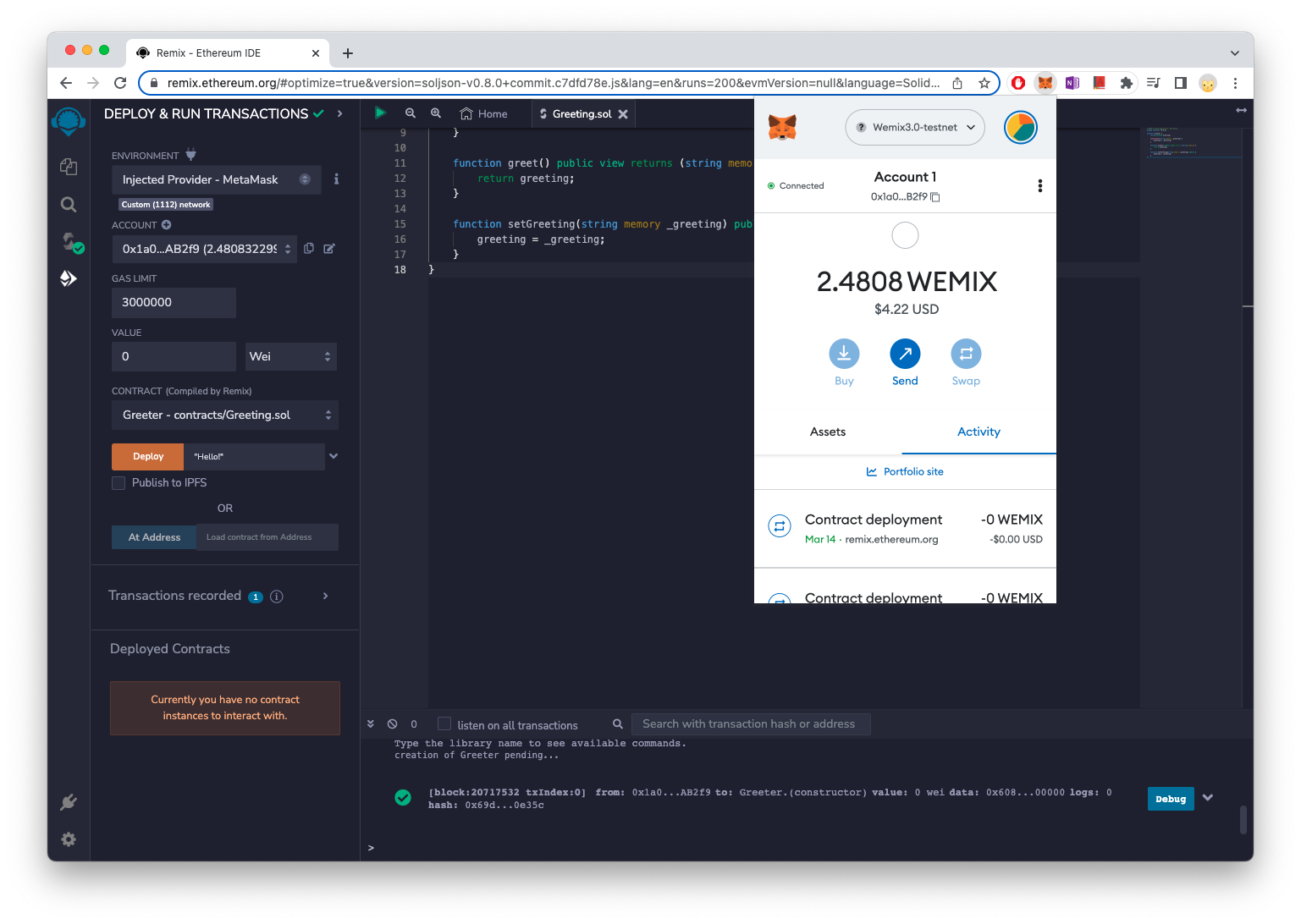 To deploy smart contracts to the WEMIX3.0 Testnet via MetaMask, add the WEMIX3.0 Testnet from the MetaMask plug-in installed in your web browser, select the account you want to use, and then select 'Injected Provider - MetaMask' from ENVIRONMENT on the 'DEPLOY & RUN TRANSACTION' tab.&#x20;