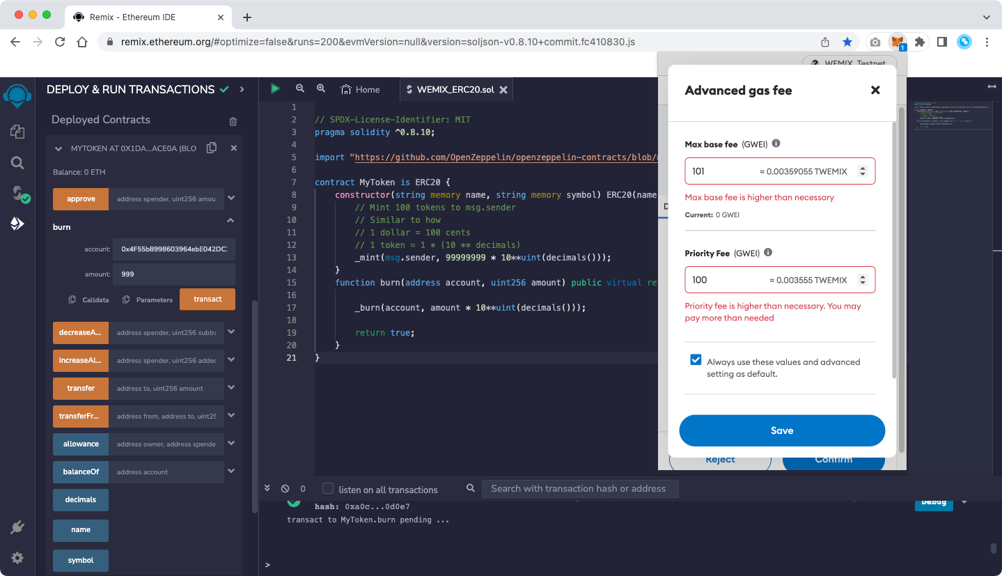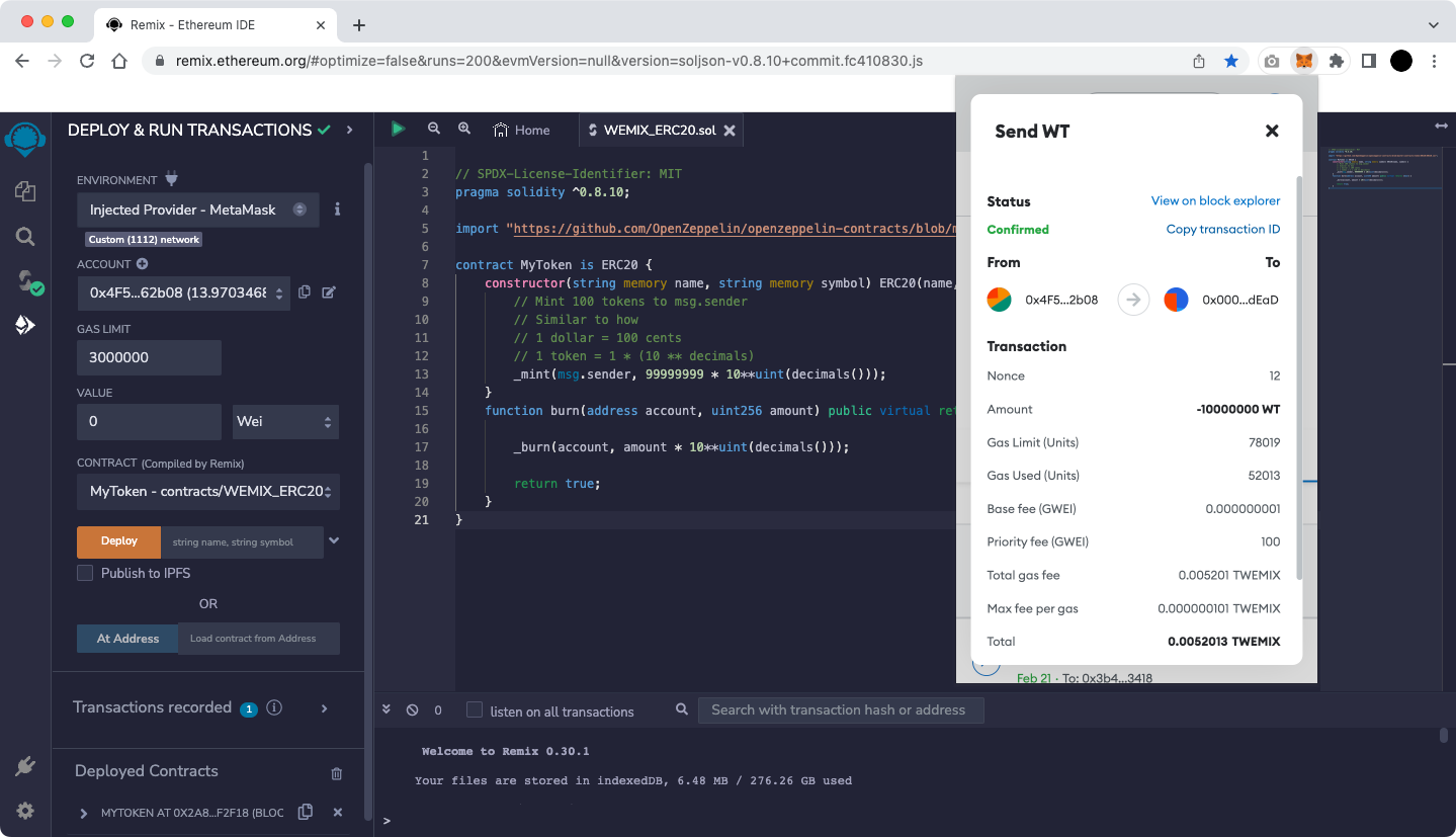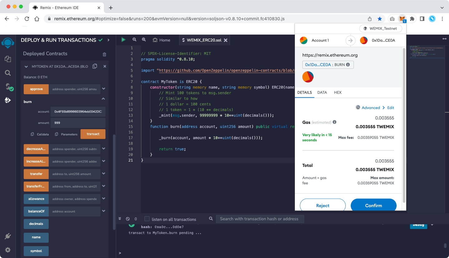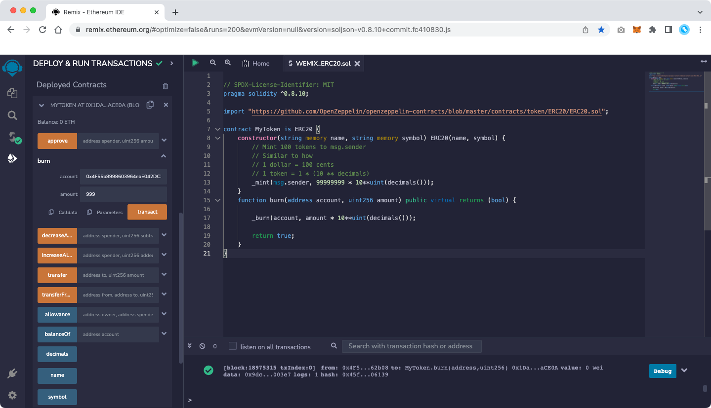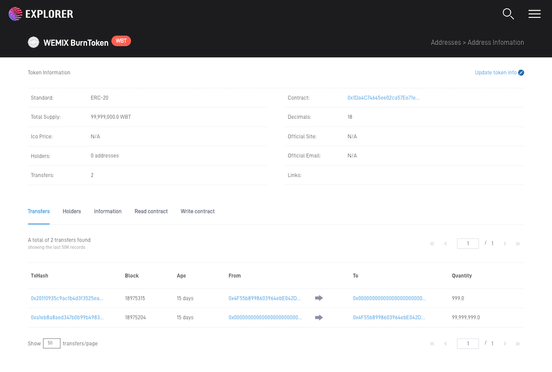 The figure below shows an example of burning 999 WBT Token after deploying WEMIX BurnToken Contract.