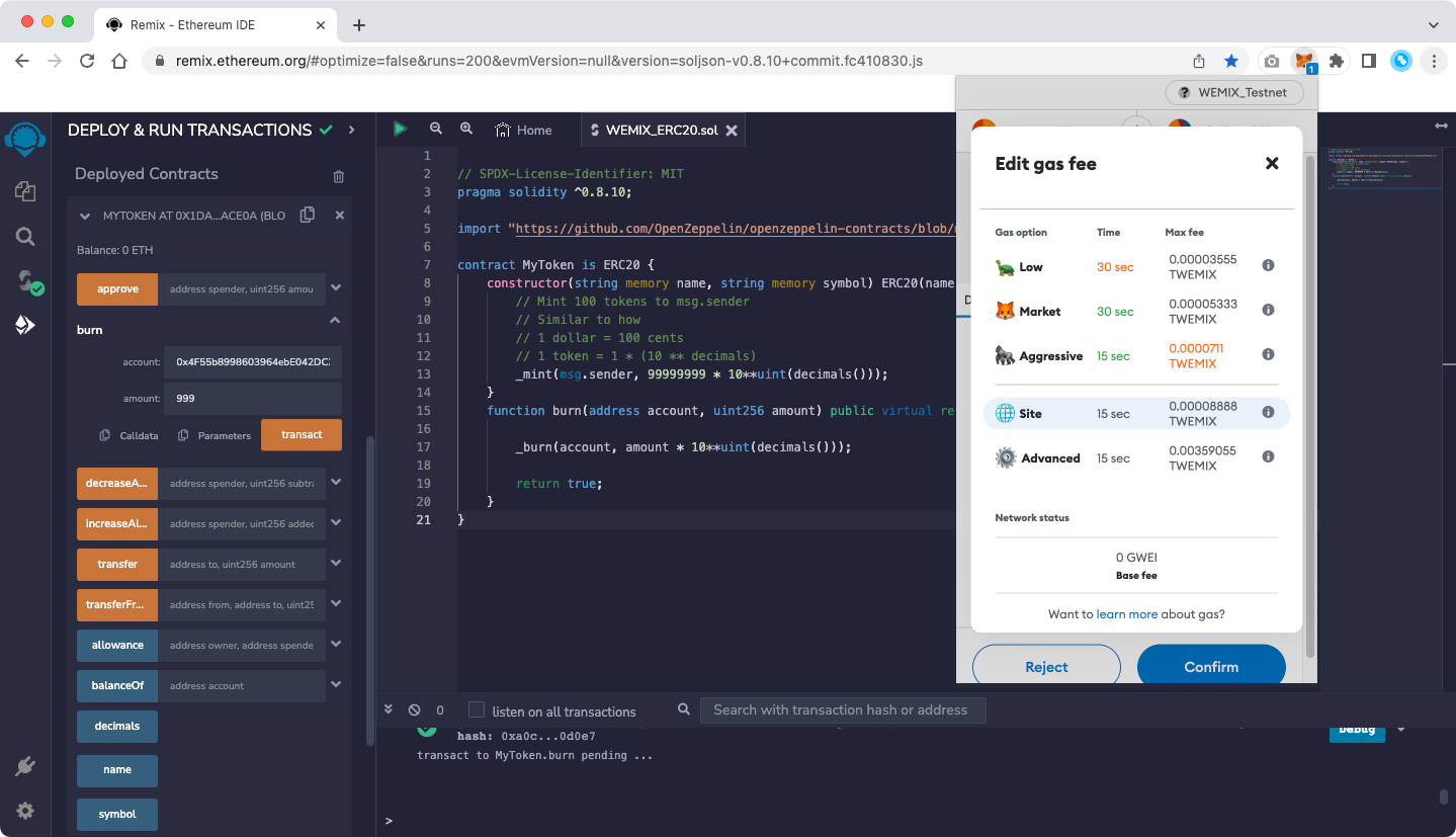 When you select 'Next' after entering Token amount that you want to burn, a MetaMask pop-up appears and a screen showing the default 'Gas Fee' based on Ethereum appears.