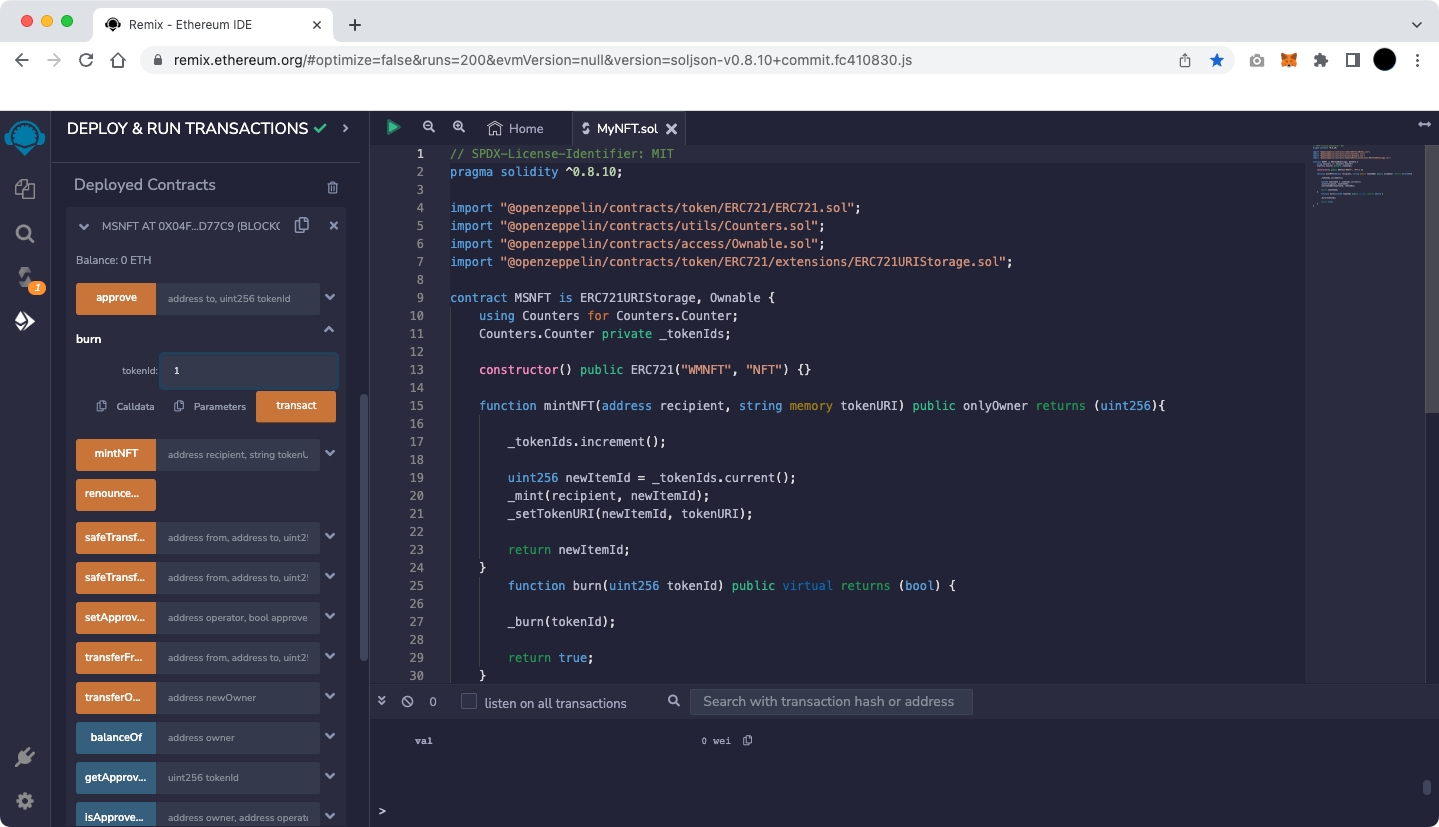 If a green check mark appears at the bottom of the Remix screen as shown below, the burning ERC-721 Token is completed normally.