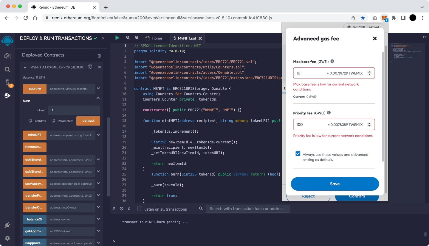 Copy the transaction hash that appears as a result of the run, and search in Testnet Explorer, to confirm that the ERC-721 Token has been burned.