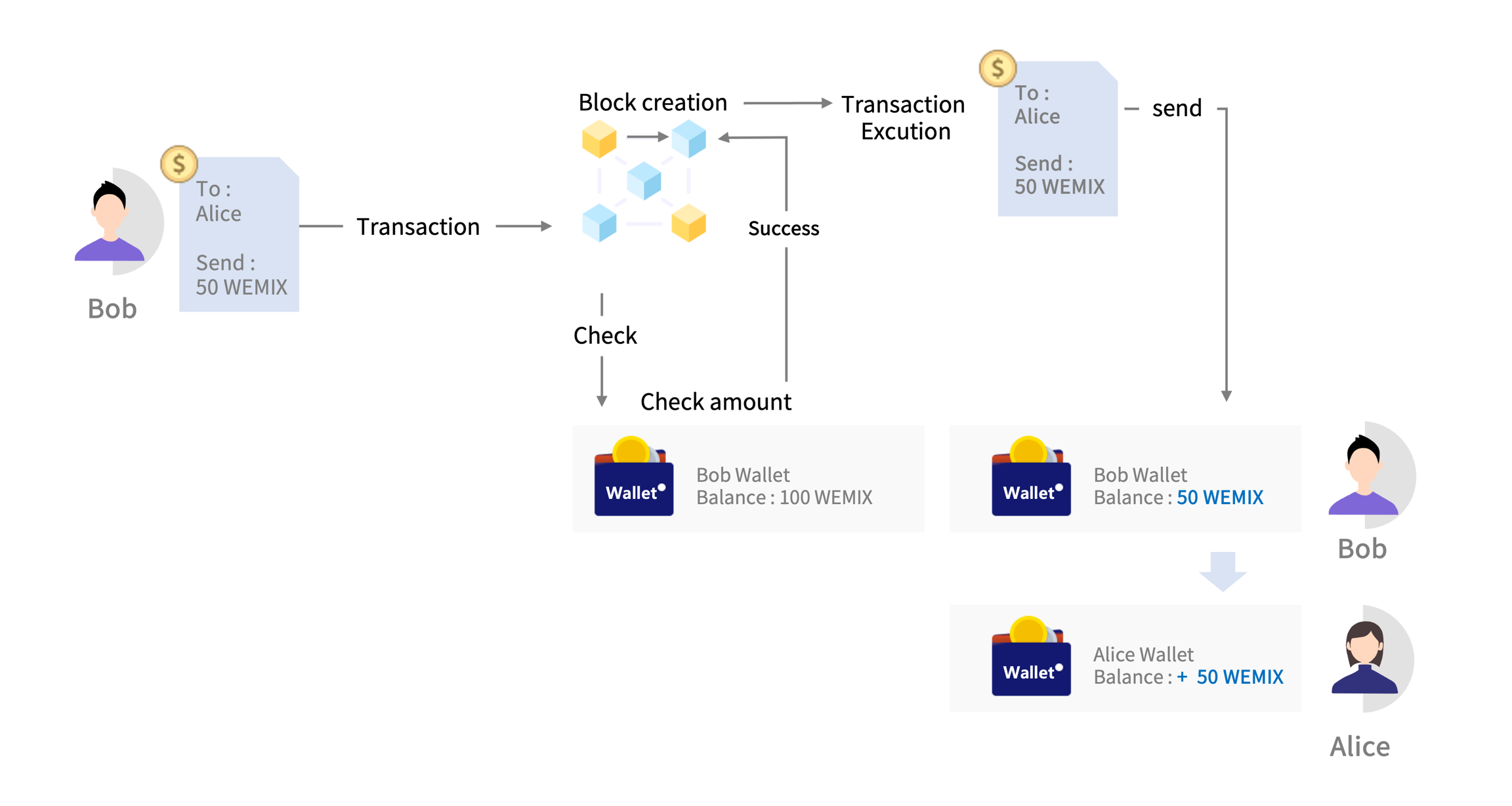 Bob이 50 WEMIX(수수료 포함)를 Alice에게 전송한다고 가정해 보겠습니다. Bob은 Alice에게 50 WEMIX를 전송한다는 트랜잭션을 보냅니다. Bob의 주소에 전송할 수 있는 수량이 있는지 확인합니다. 전송할 수 있는 수량이 없다면 트랜잭션은 실패하지만, 전송 가능한 수량이 있다면 블록 생성자가 블록을 생성할 때까지 기다립니다. 블록이 생성되었을 때 Bob이 보낸 트랜잭션이 정상적으로 기록되었다면, 해당 트랜잭션을 수행합니다. Bob의 주소에 있던 100 WEMIX 중 50 WEMIX가 Alice의 지갑 주소로 전송됩니다.