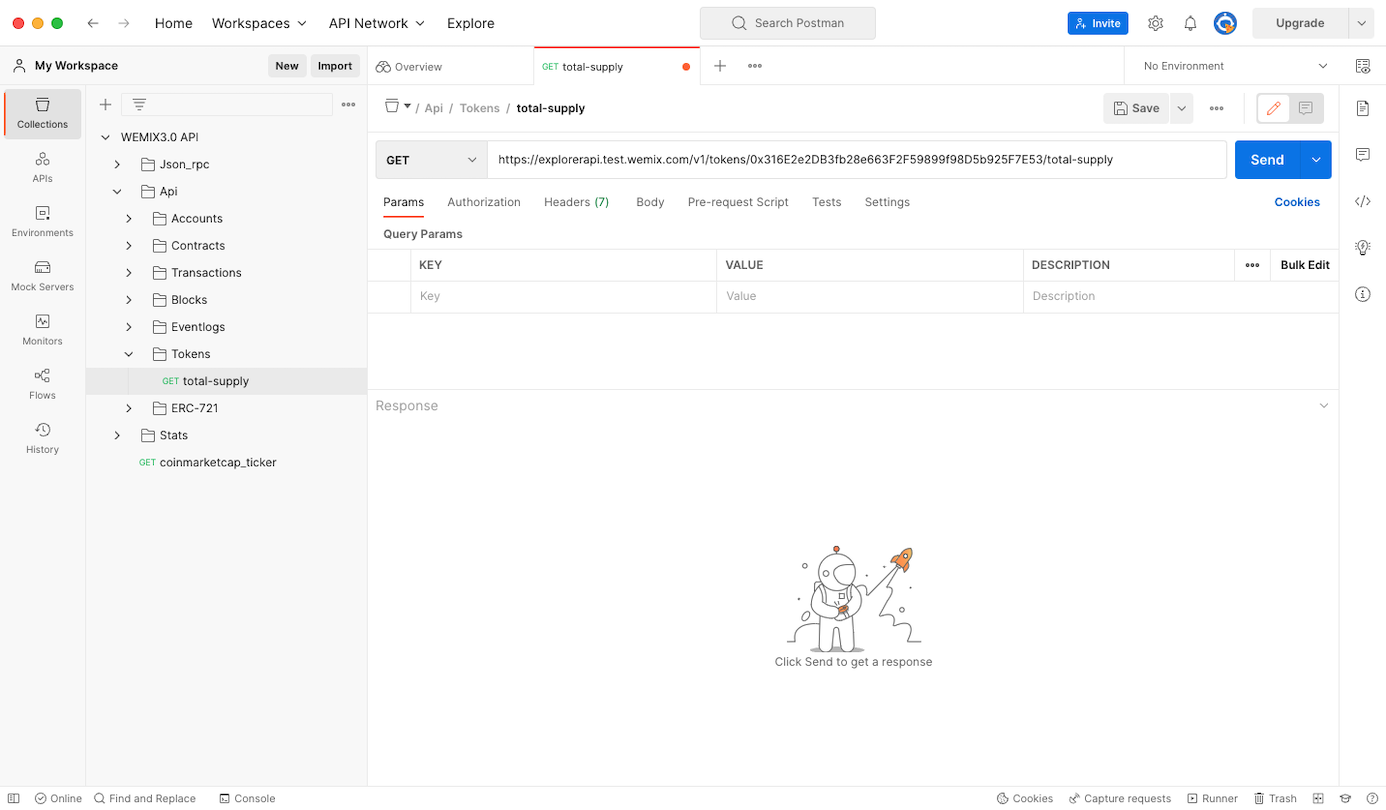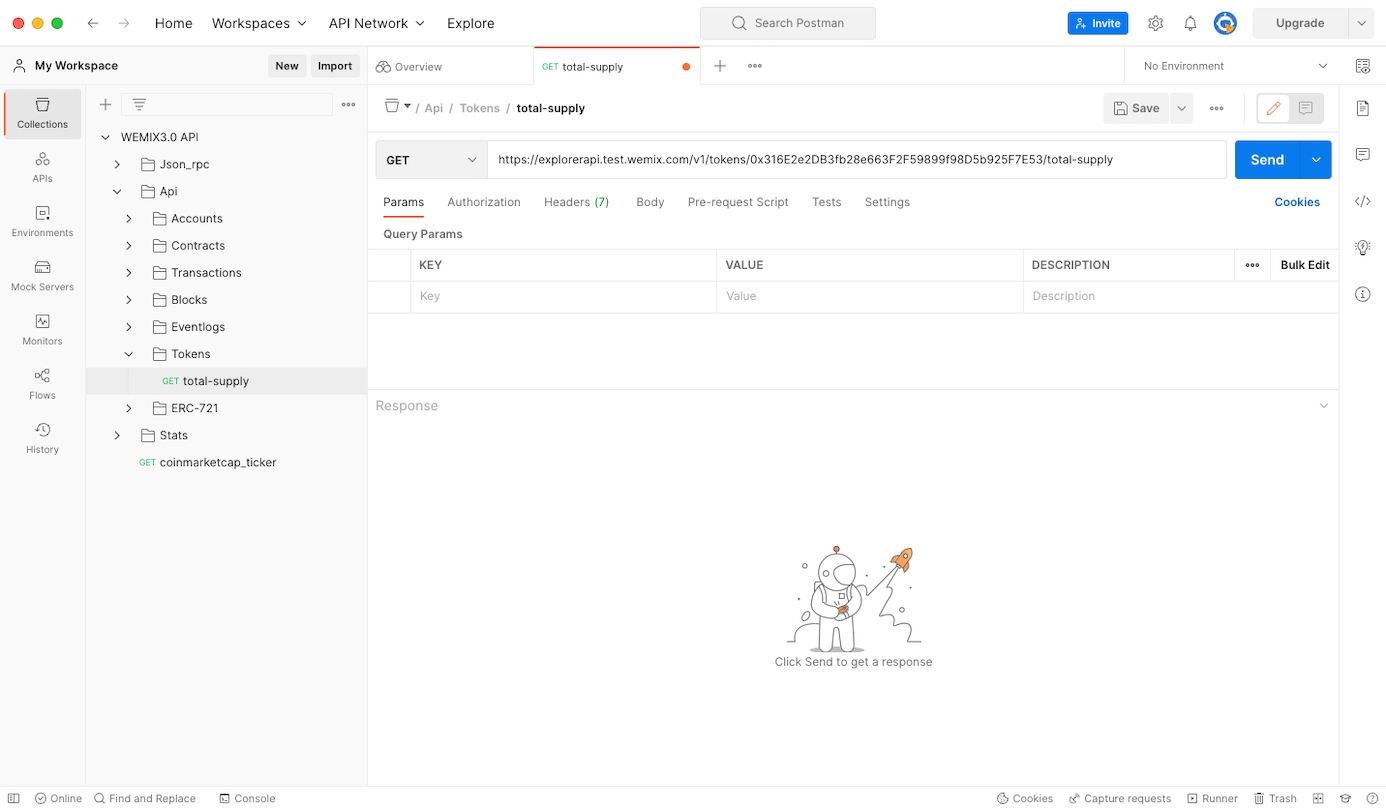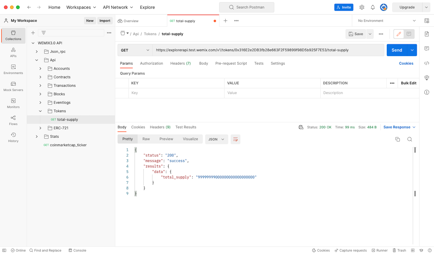 WEMIX3.0 API 목록에서 API > Tokens > total-supply를 선택하여 사용자가 원하는 ERC-20 토큰을 조회할 수 있습니다.