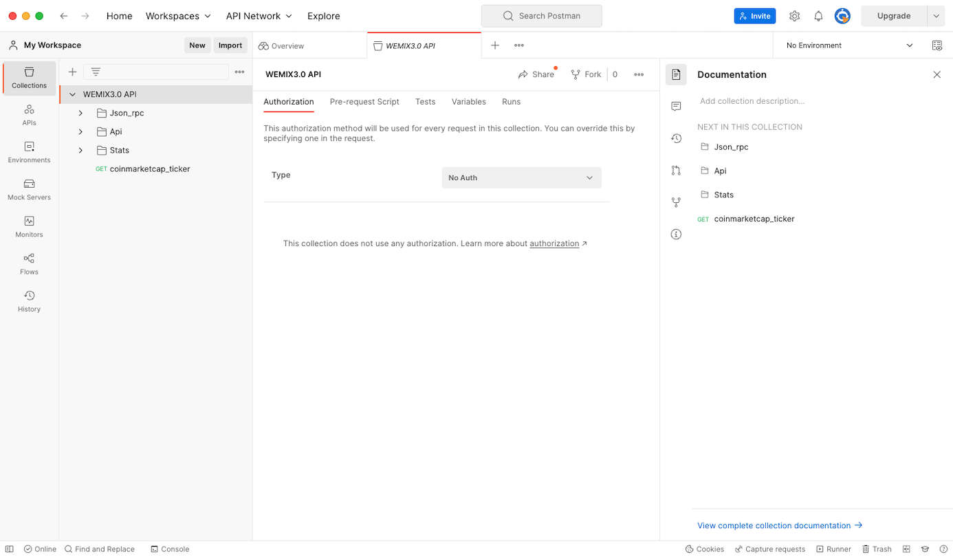 <figure><img src="https://content.gitbook.com/content/iXnTk8WgxaTaNidAuUYQ/blobs/MG8Fm2bNNfubT2RI6IBI/01.Postman%20WEMIX3.0%20API%20%E1%84%89%E1%85%B5%E1%86%AF%E1%84%92%E1%85%A2%E1%86%BC.png" alt=""><figcaption><p>Postman WEMIX3.0 API 실행</p></figcaption></figure>