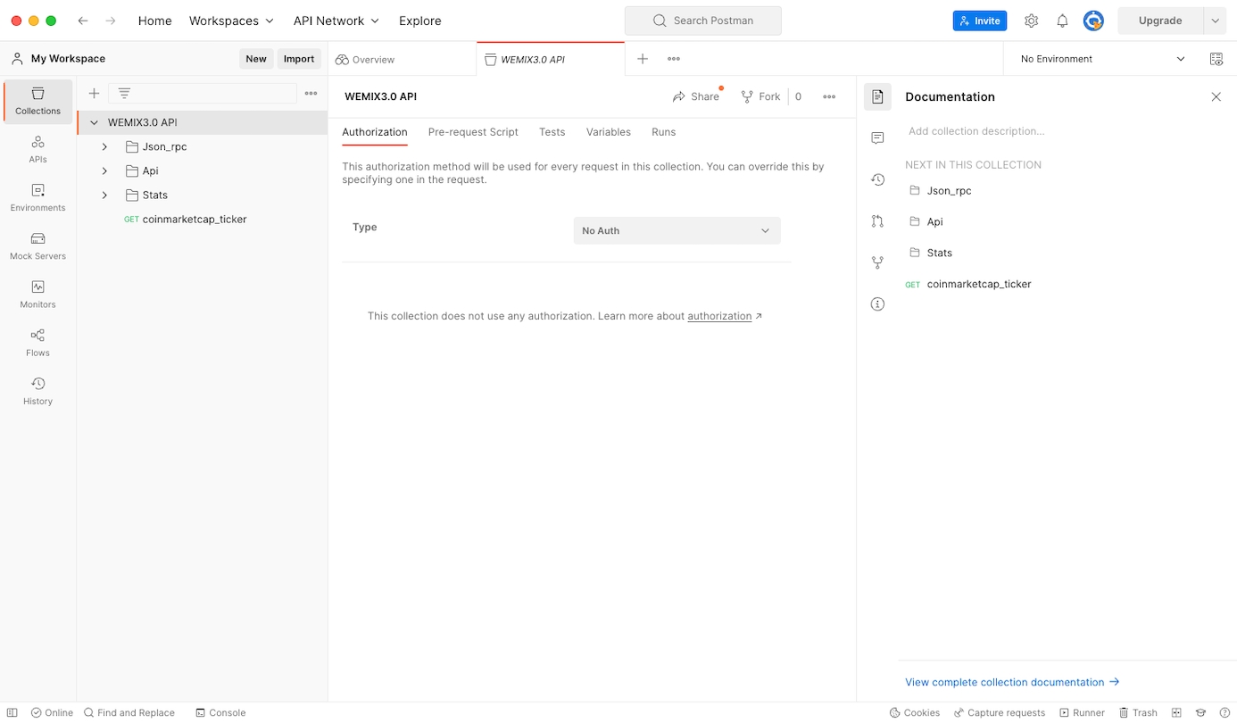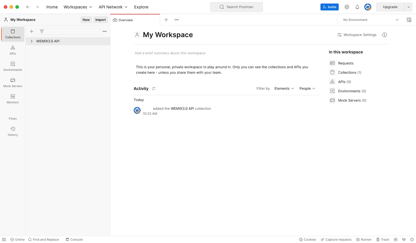 'Import' 버튼을 선택하여 WEMIX3.0 API.json 파일을 넣어 WEMIX3.0 API를 실행합니다.