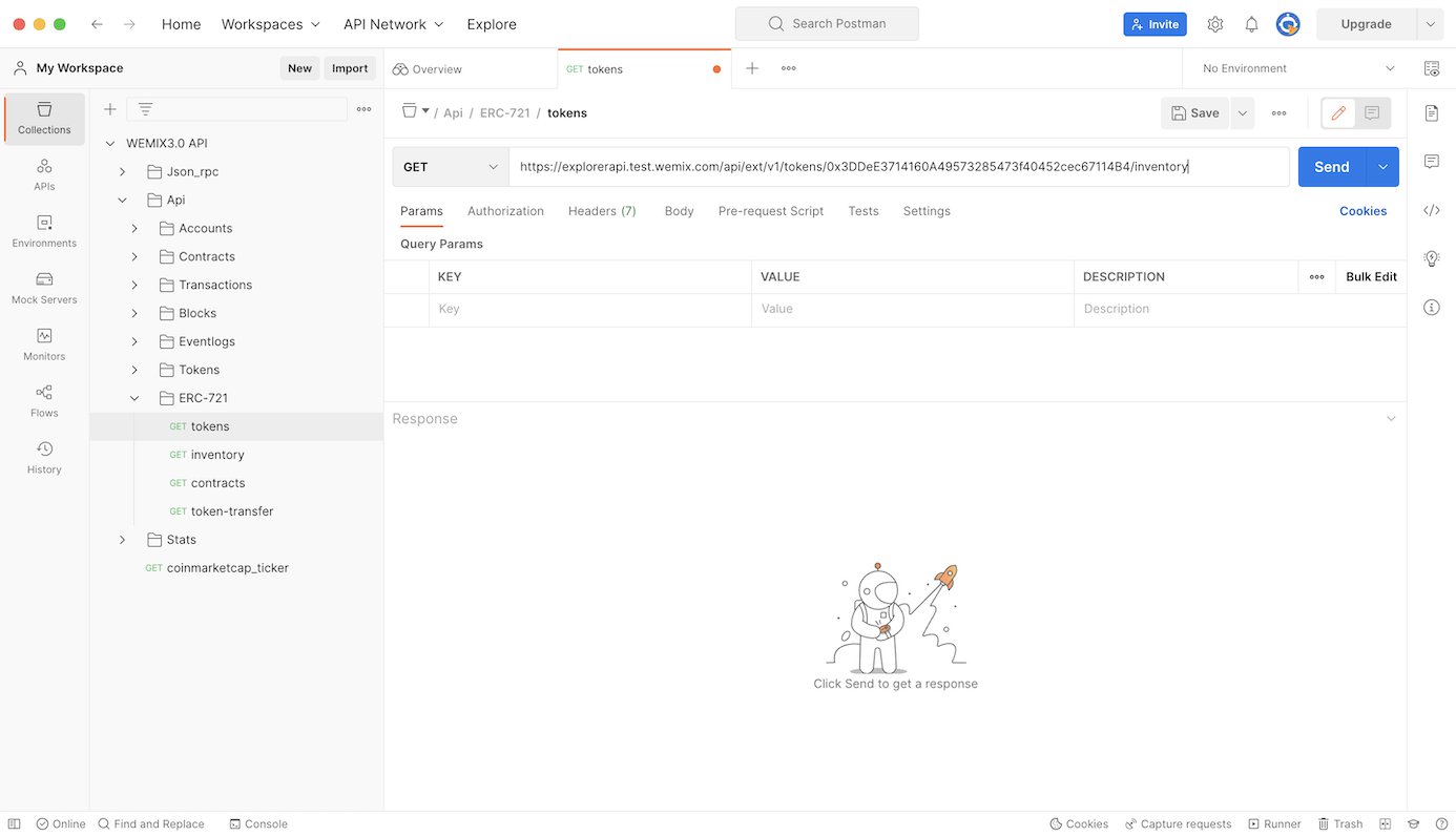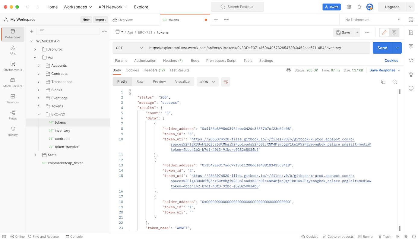<figure><img src="https://content.gitbook.com/content/iXnTk8WgxaTaNidAuUYQ/blobs/uuezt1tkH6qB8HjlsqKI/WEMIX3.0%20Testnet%20Explorer%20Token%20Inventory_API%20%EC%A1%B0%ED%9A%8C.png" alt=""><figcaption><p>WEMIX3.0 Testnet Explorer Token Inventory</p></figcaption></figure>