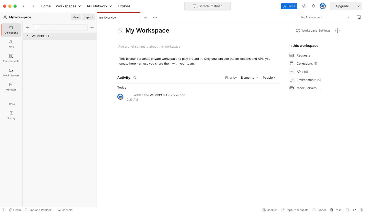 'Import' 버튼을 선택하여 `WEMIX3.0 API.json` 파일을 넣어 WEMIX3.0 API를 실행합니다.