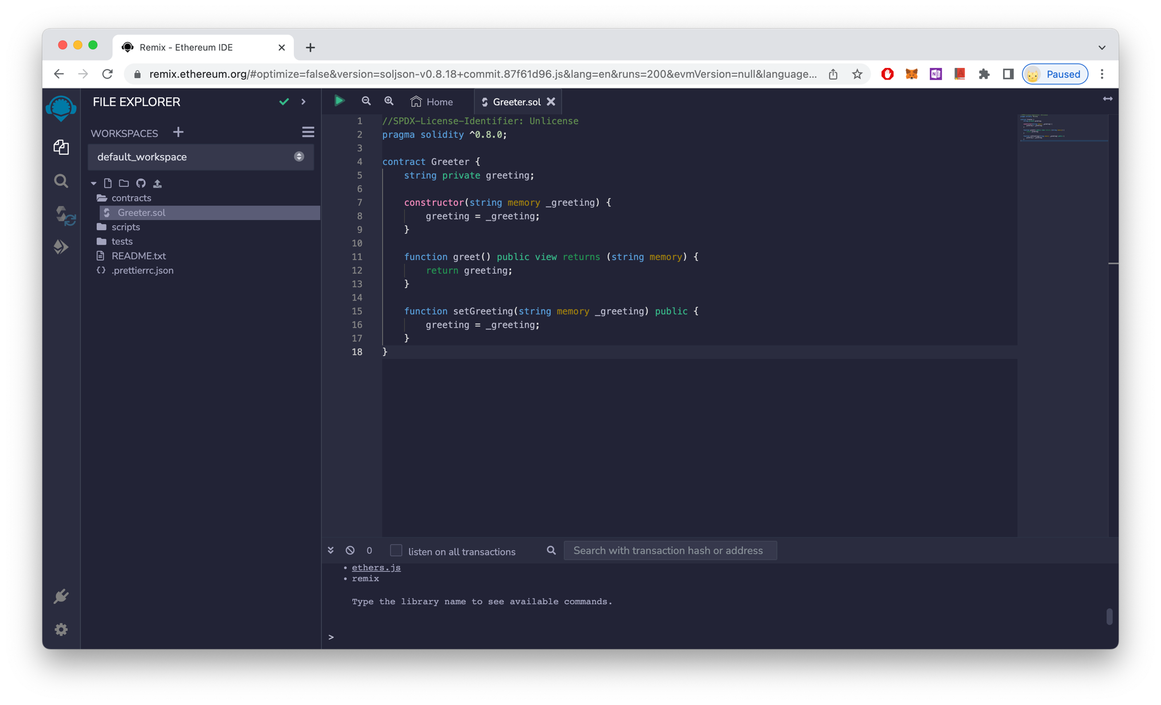 Remix IDE를 방문하면 미리 생성되어 있는 컨트랙트들이 있습니다. 이 컨트랙트들을 선택하여 지우고 새로 Greeter.sol을 만든 후 위 코드를 입력합니다.