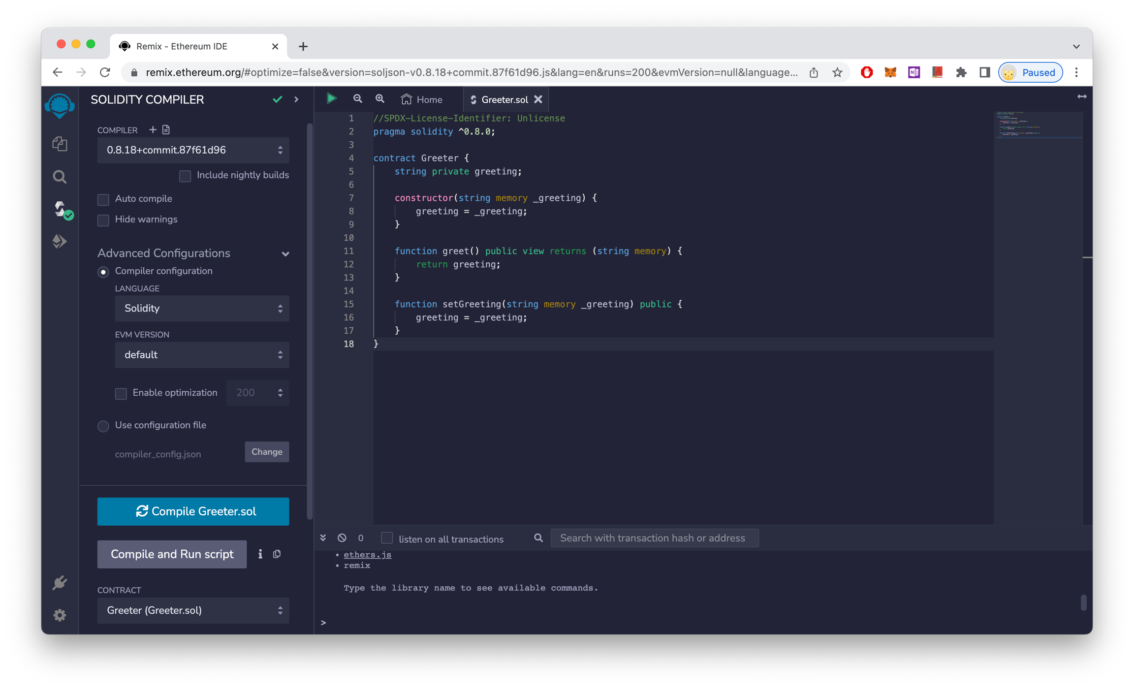 작성할 스마트 컨트랙트는 배포 시 greeting 메시지를 설정하고 이를 greet() 함수를 통해 조회하고 setGreeting() 함수를 통해 greeting 메시지 변경하는 솔리디티 코드입니다.