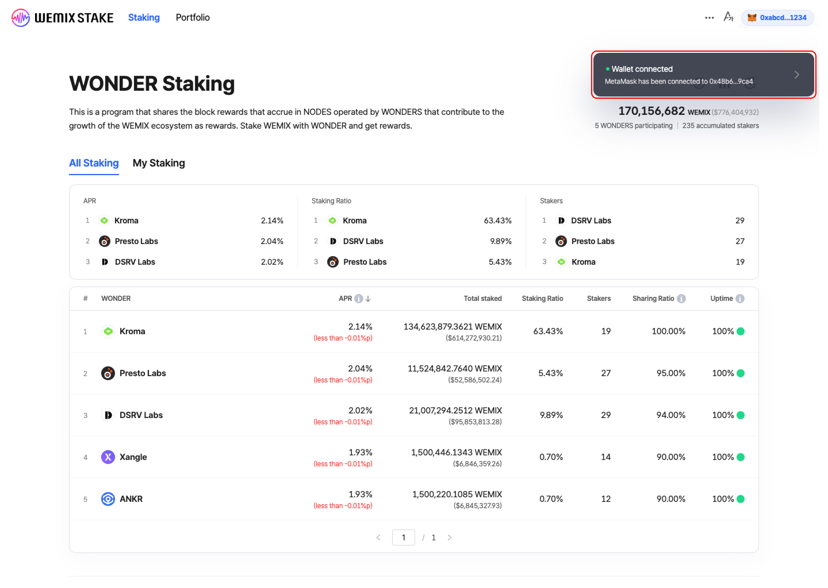 * After connecting your wallet, you can confirm that the connection to WEMIX.Fi was successful through the pop-up **Wallet Connected** on the upper right of the screen.