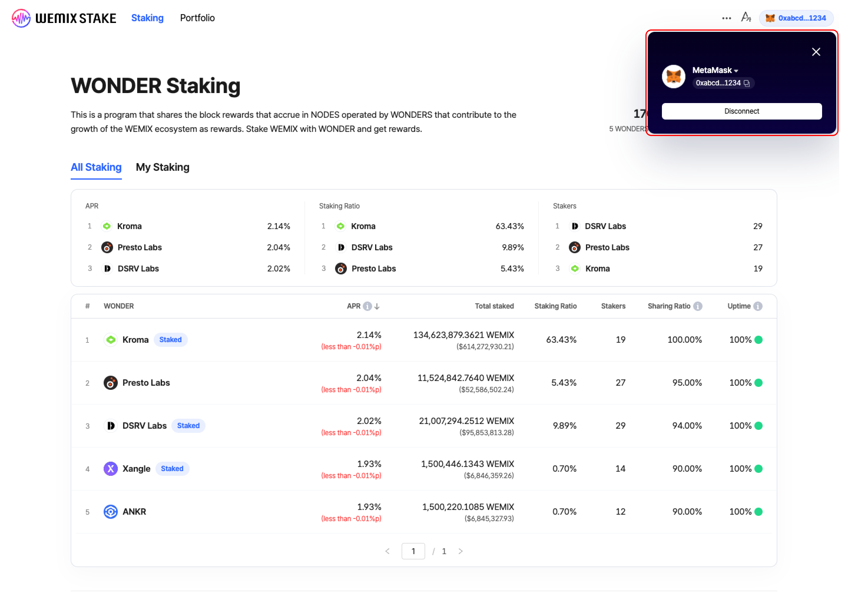 * You can check the status and details of your wallet on WEMIX.Fi by clicking on the wallet address in the upper right corner of the screen.