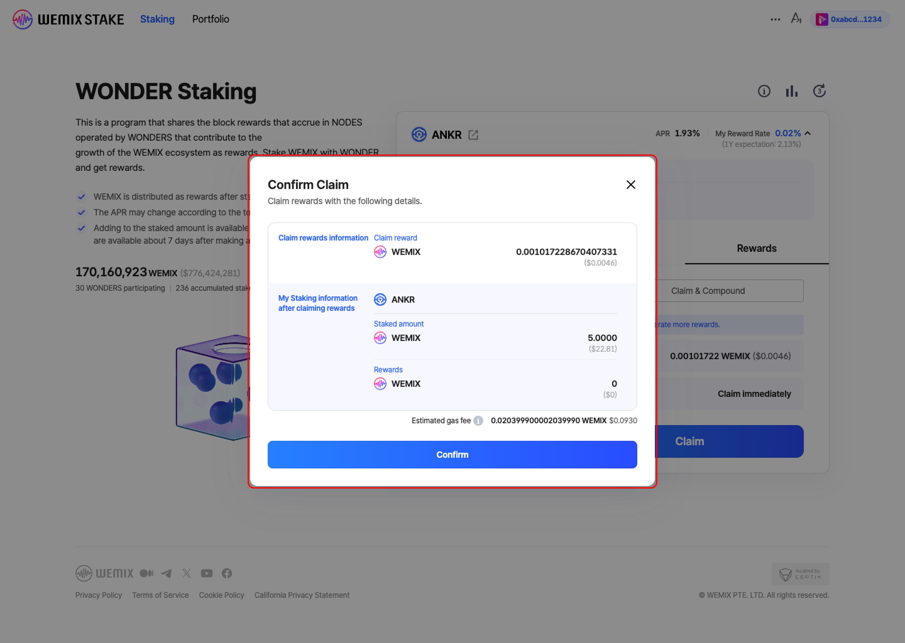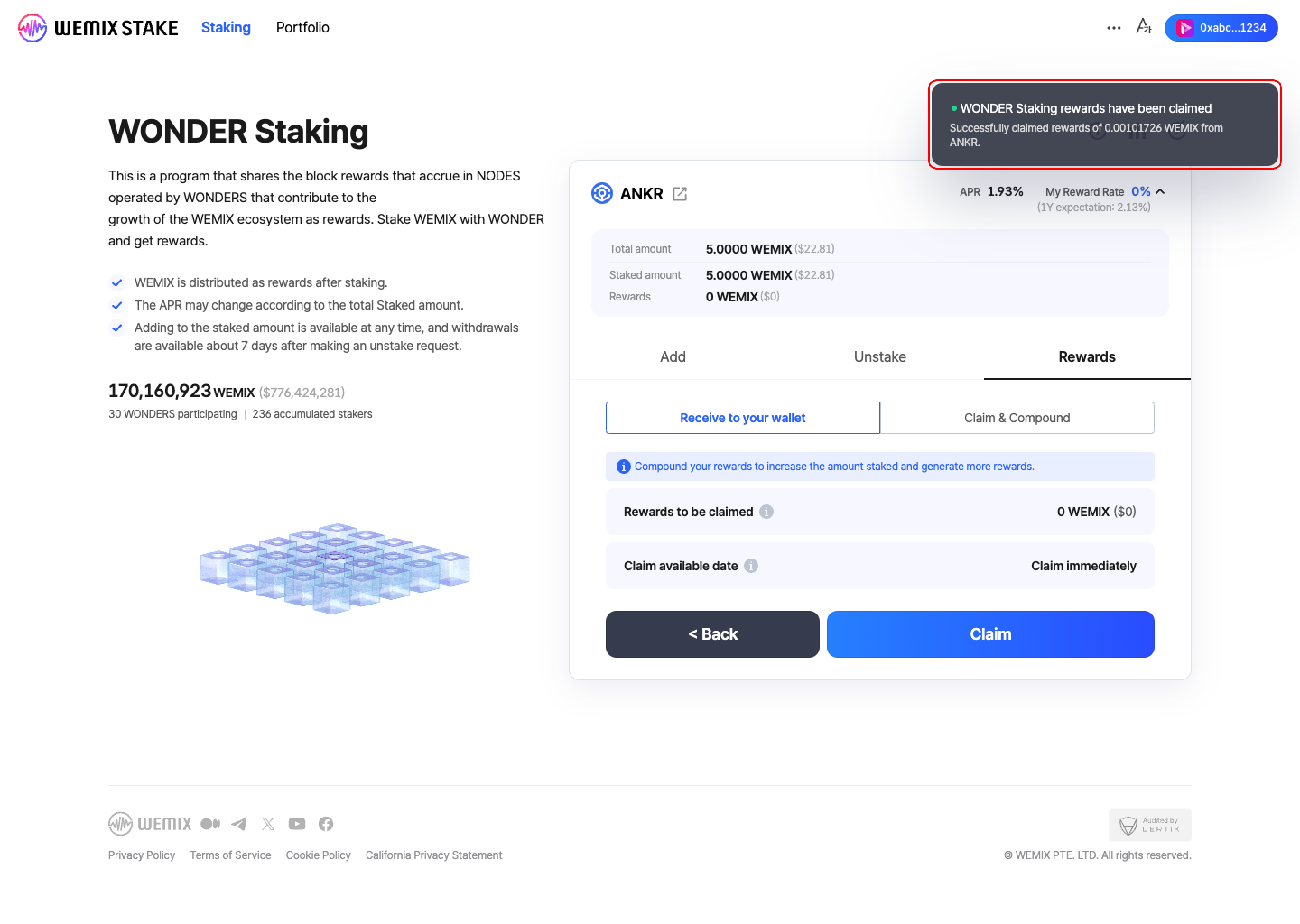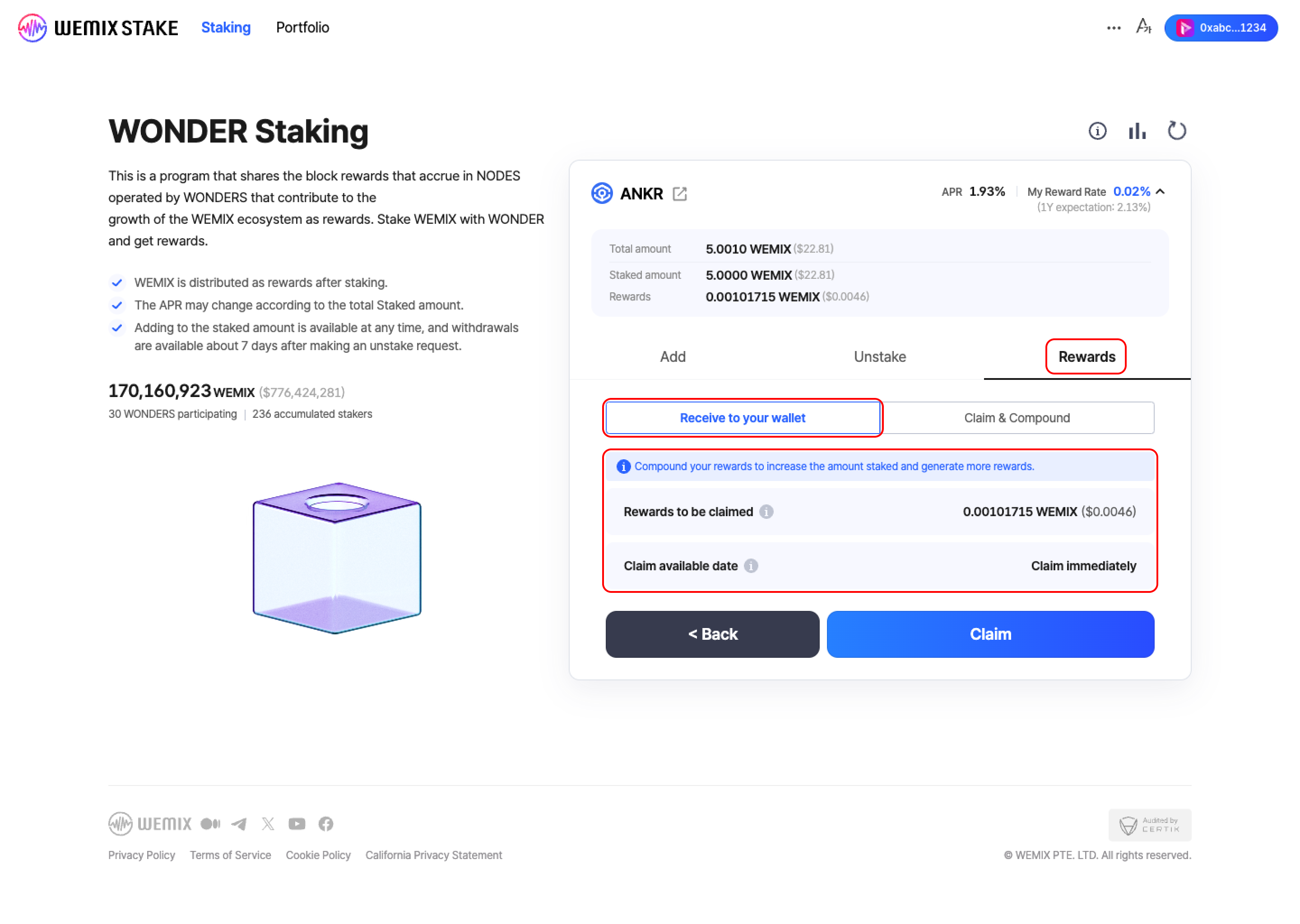 * If you withdraw the reward generated from WONDER Staking, you can withdraw it immediately without any waiting period. The reward withdrawal allows you to receive all the rewards generated so far in your wallet.