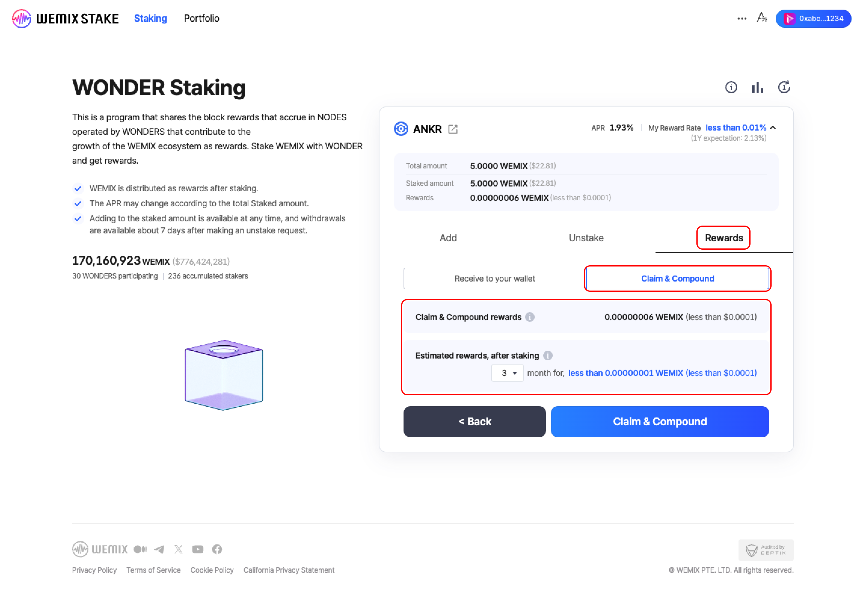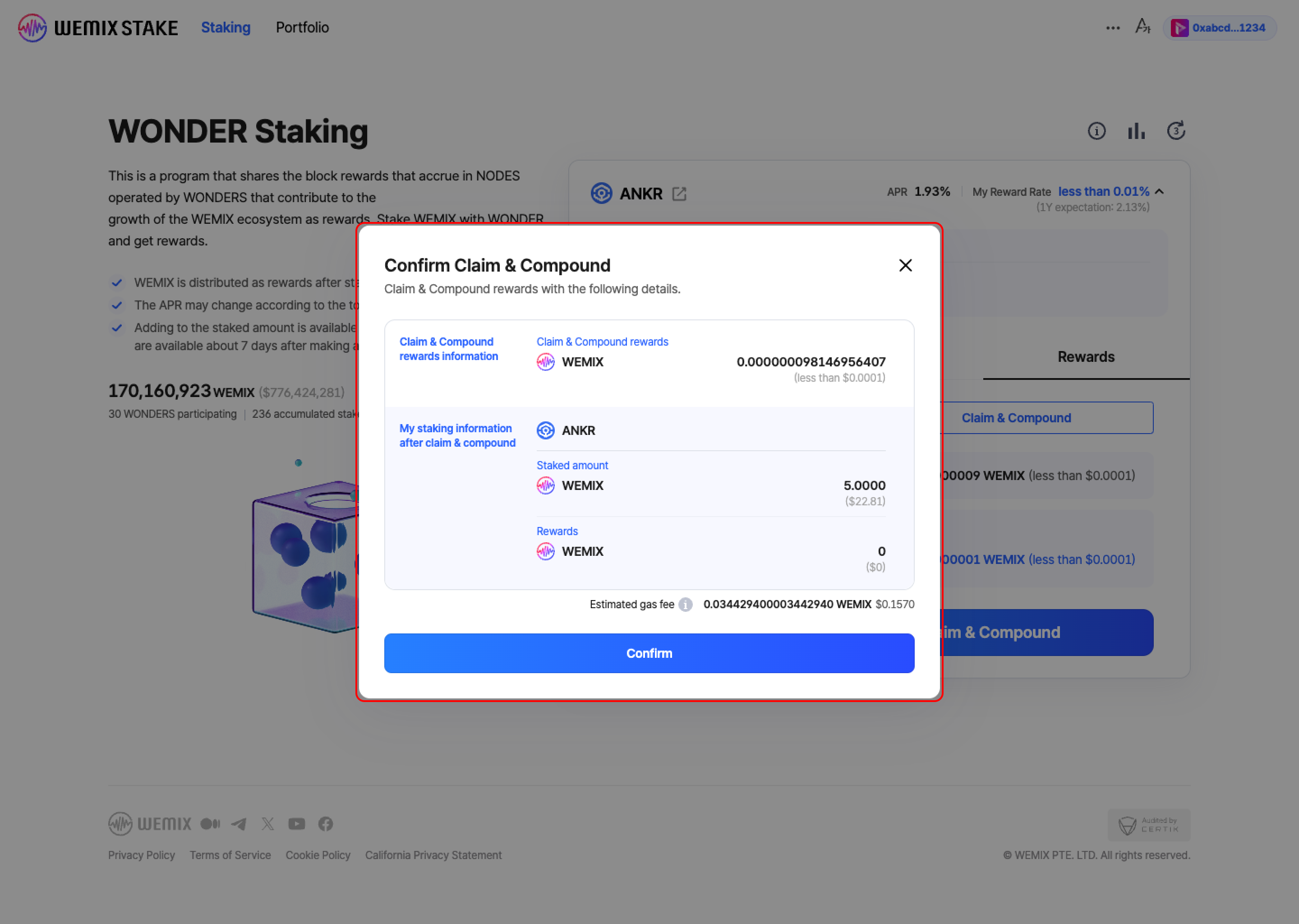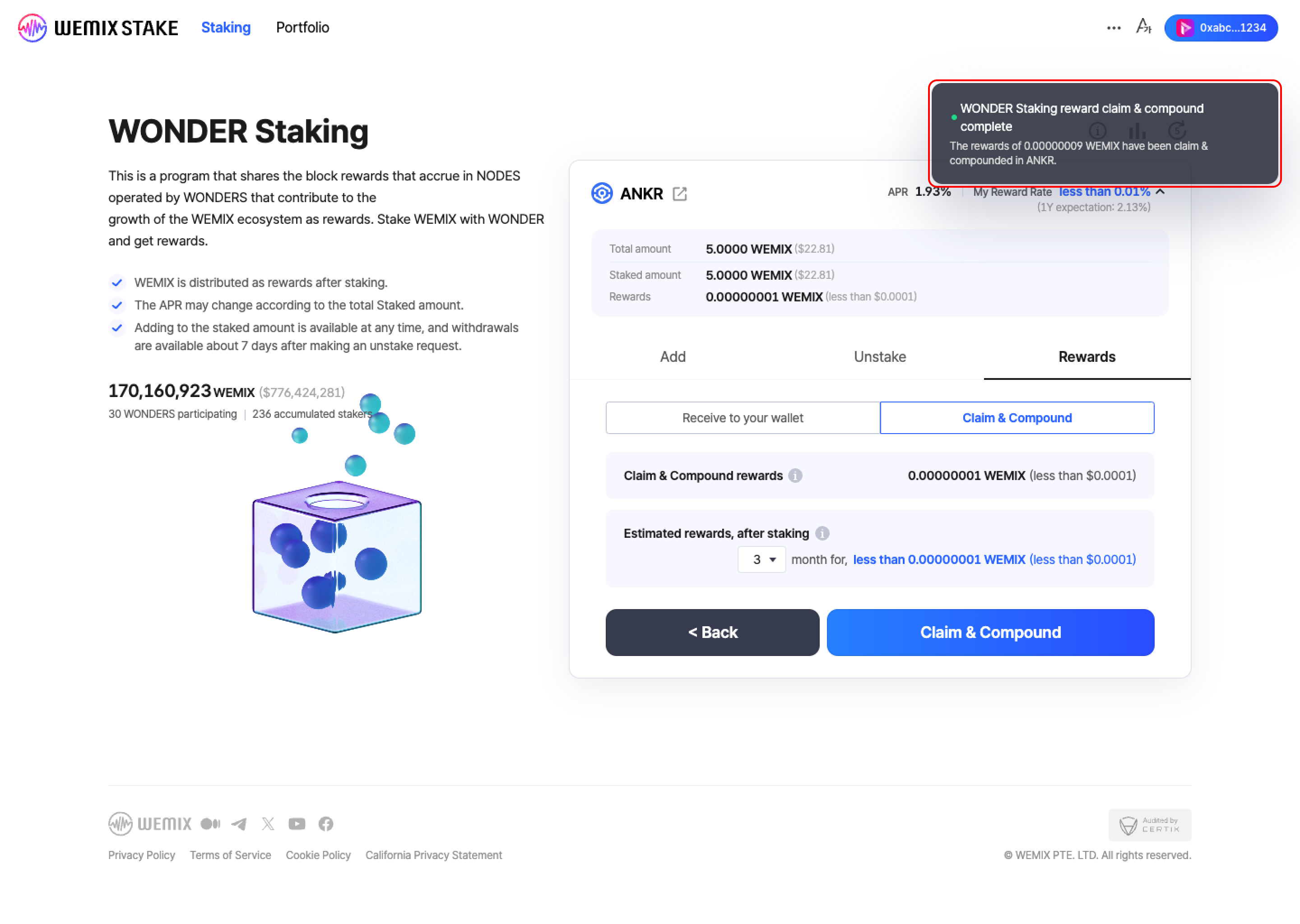 * If you withdraw the reward generated from WONDER Staking, you can withdraw it immediately without any waiting period. The reward withdrawal allows you to receive all the rewards generated so far in your wallet.