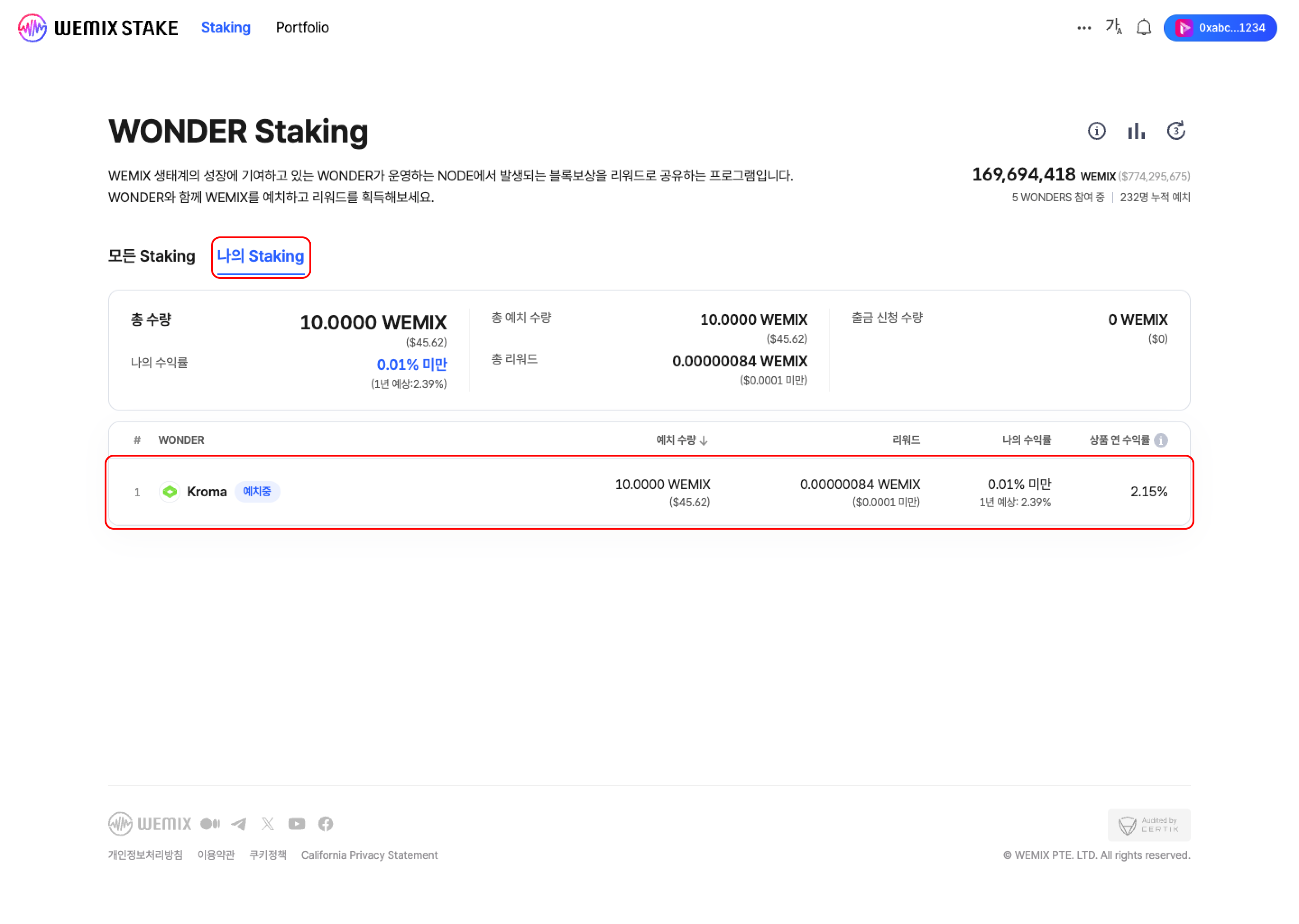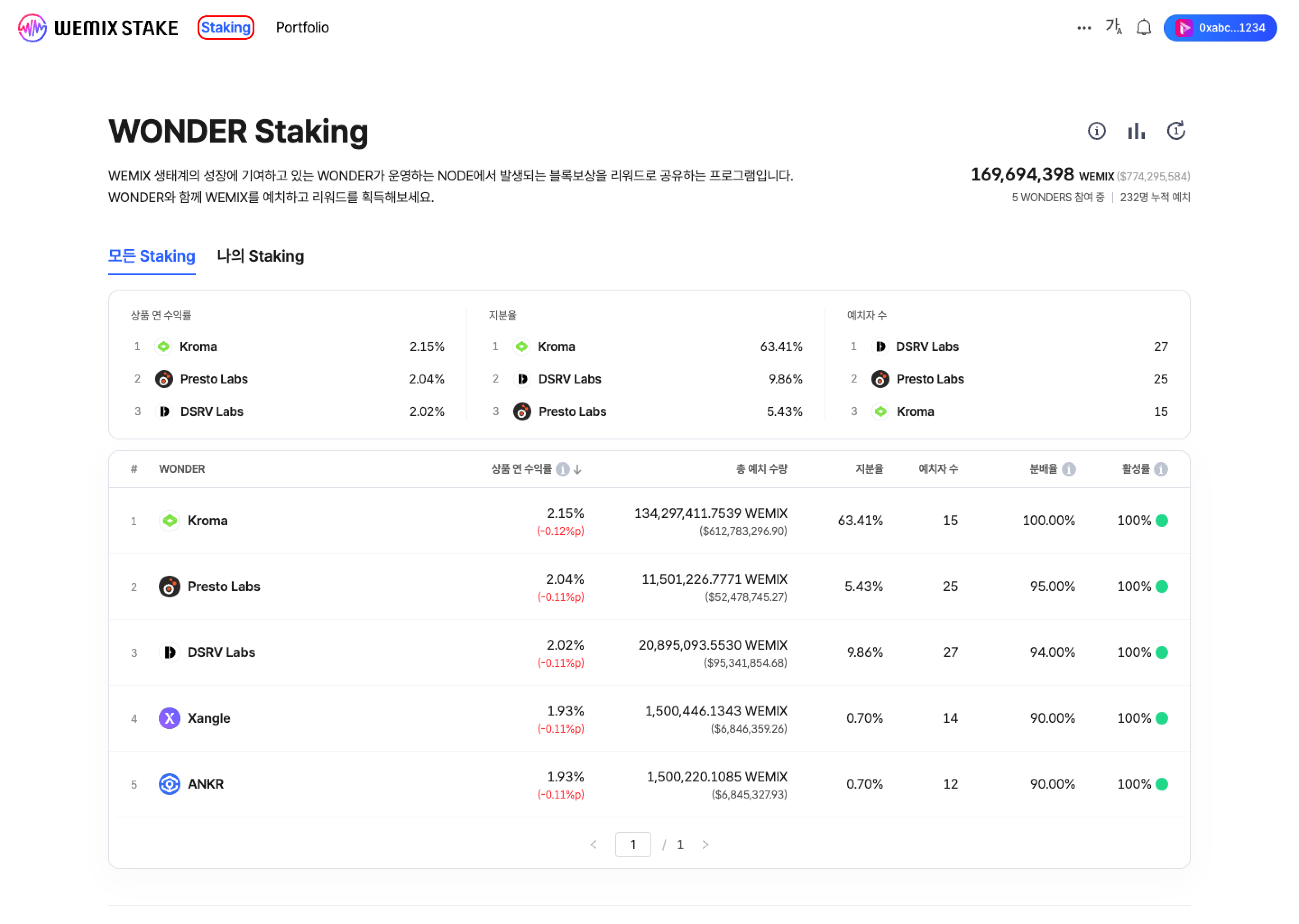 * 모든 Staking 메뉴에서 원더들을 확인할 수 있습니다. 목록 상단에는 상품 연 수익률, 지분율, 그리고 예치자 수에 따른 Top 3 원더를 확인할 수 있습니다.