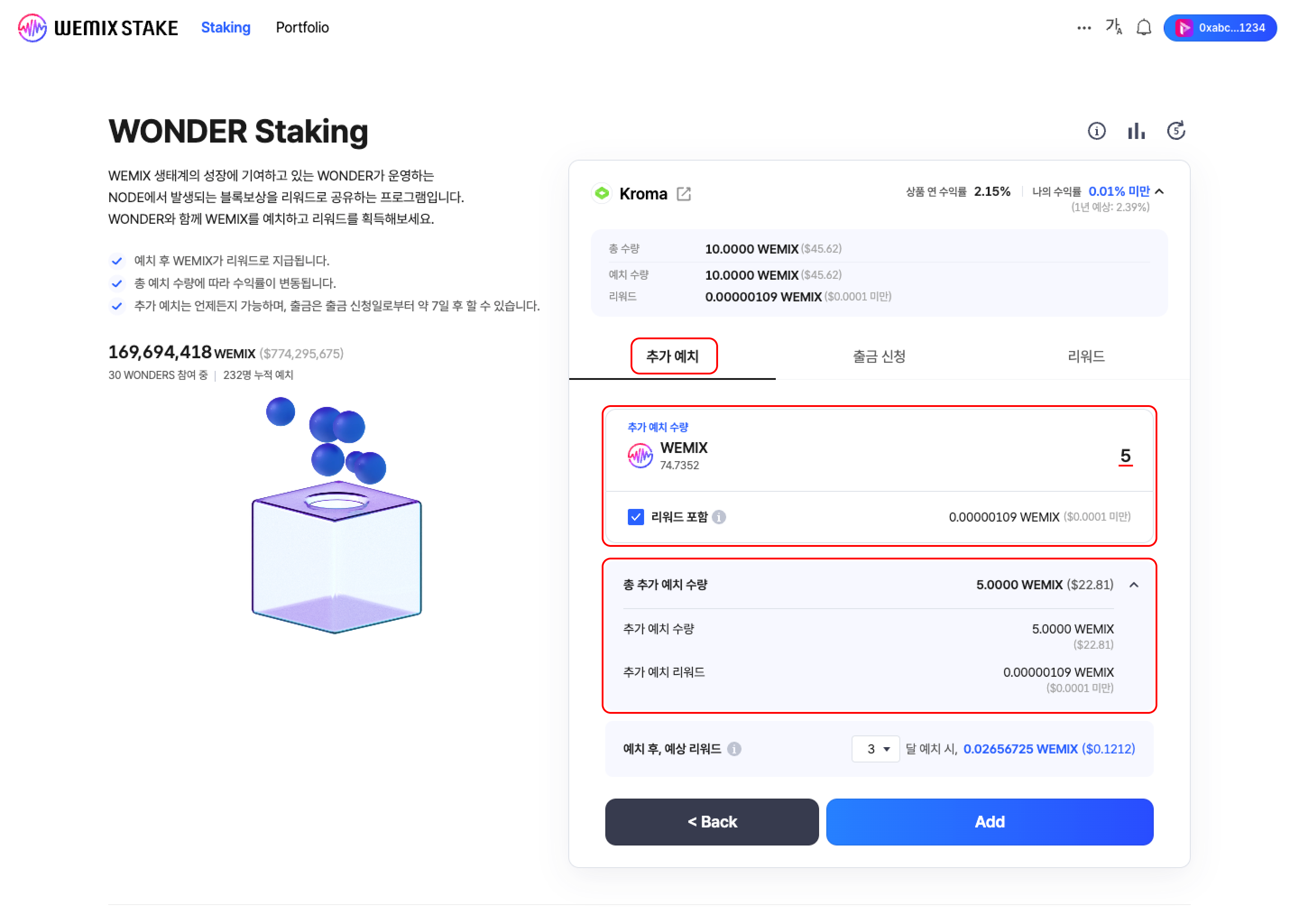 * 원더에게 예치할 추가 예치 수량을 입력합니다. 추가 예치 수량을 입력하면 총 수량에 따라 예치 수량과 리워드가 다시 계산됩니다.