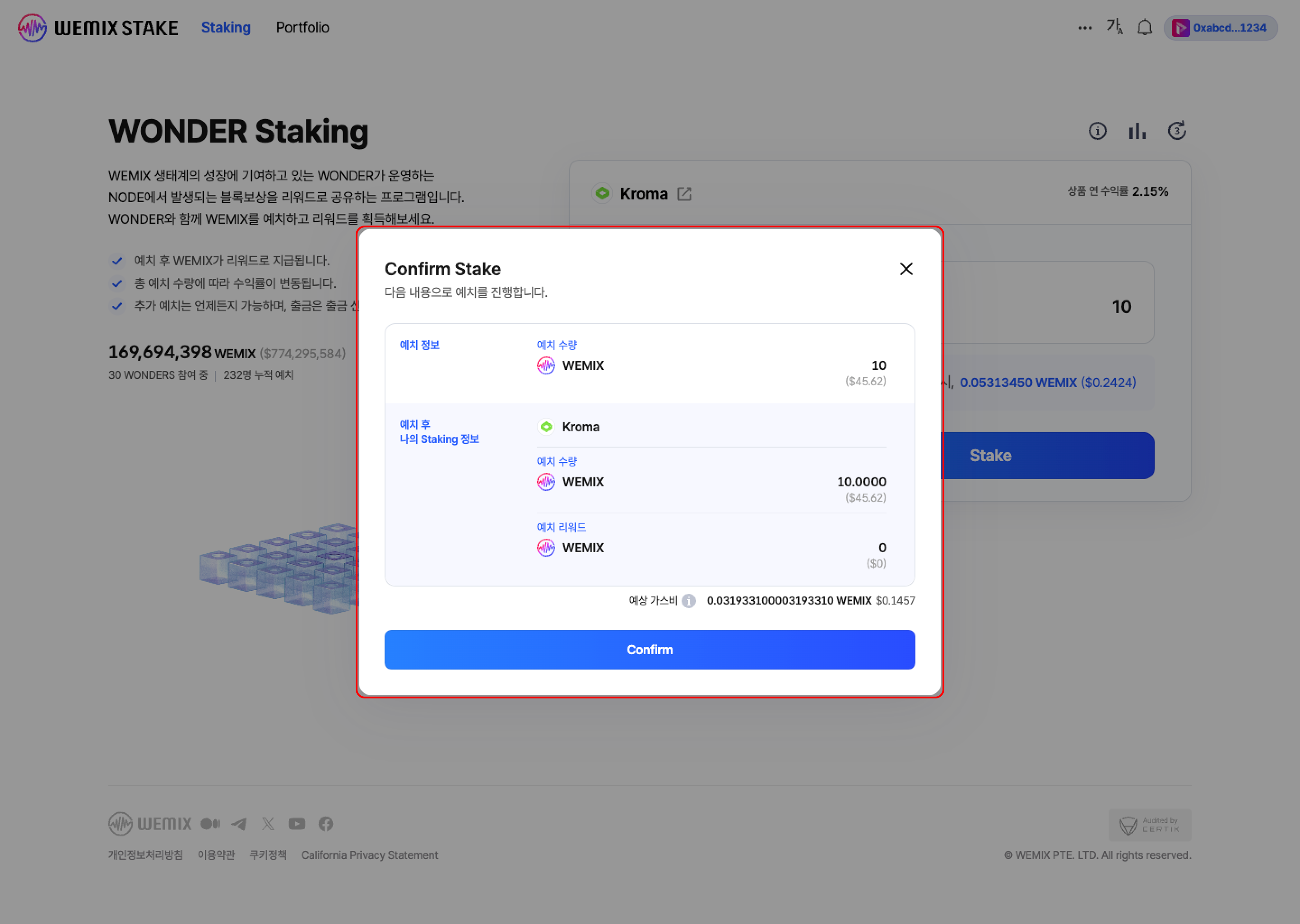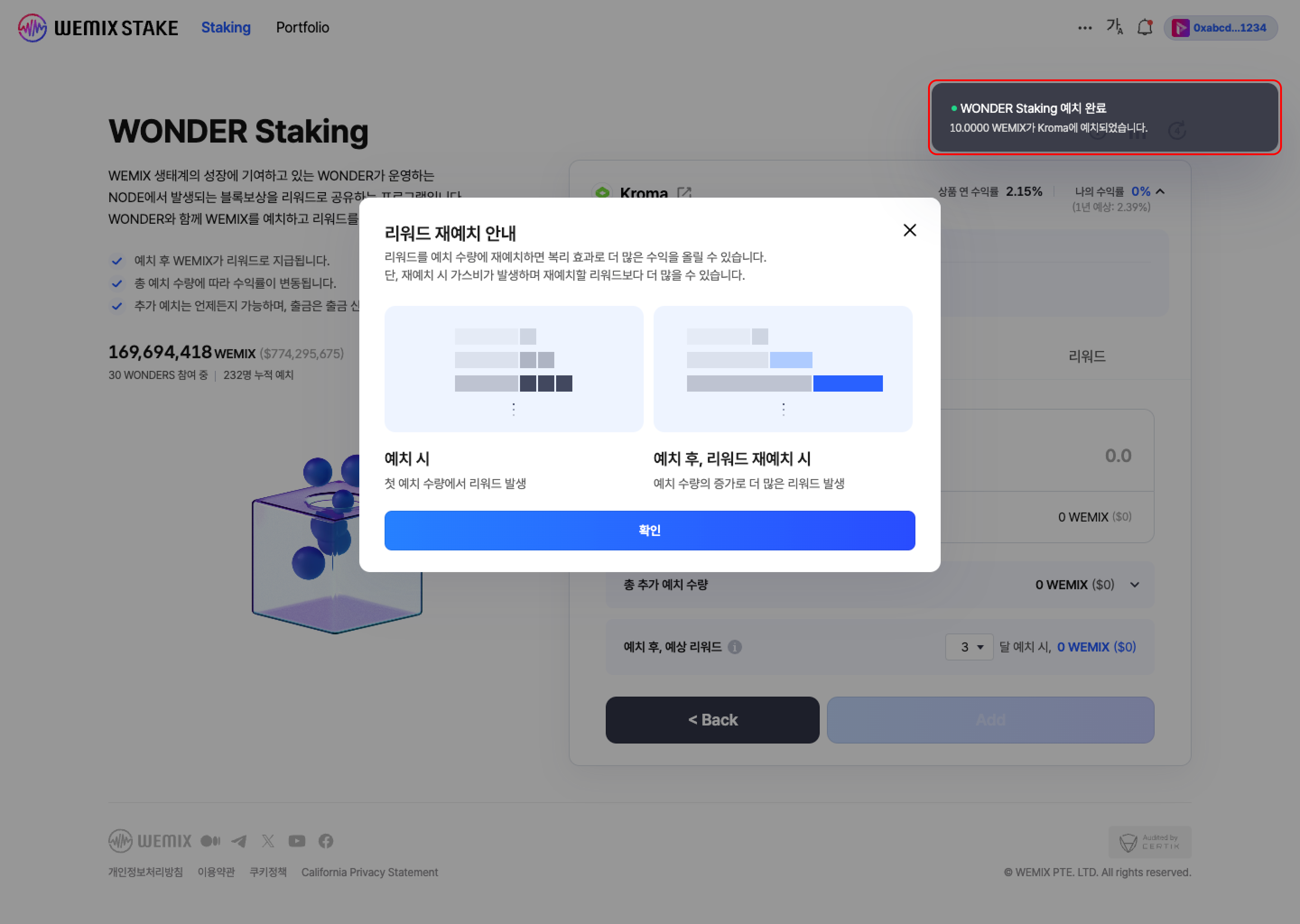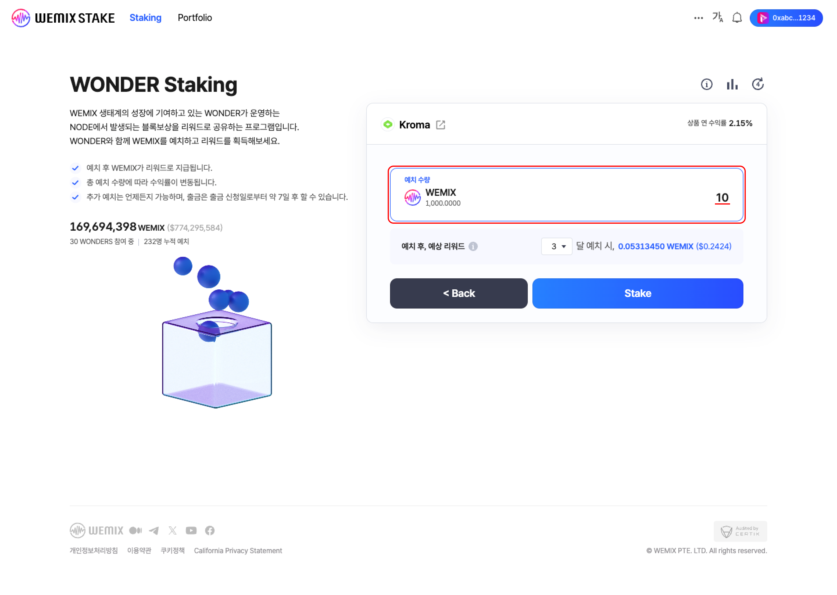 * 스테이킹 프로그램에 예치할 수량을 입력합니다. 사용자가 수량을 입력하면 예치 후, 예상 지급 리워드가 계산됩니다. 예상 지급 리워드는 원더의 총 예치 수량, 지분율, 분배율 등에 따라 계산됩니다.